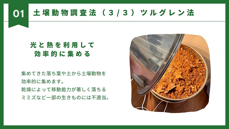 ツルグレン法は、採取した土壌を持ち帰り光と熱によって土壌動物を下に落とす方法です。
