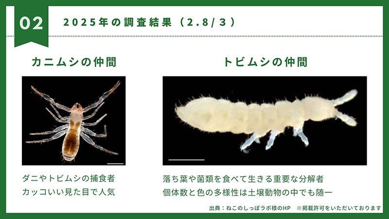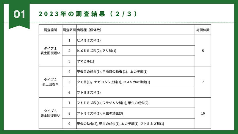 明らかに、表土回復実験した箇所は、していない箇所の3倍以上土壌動物が確認出来ています!!!