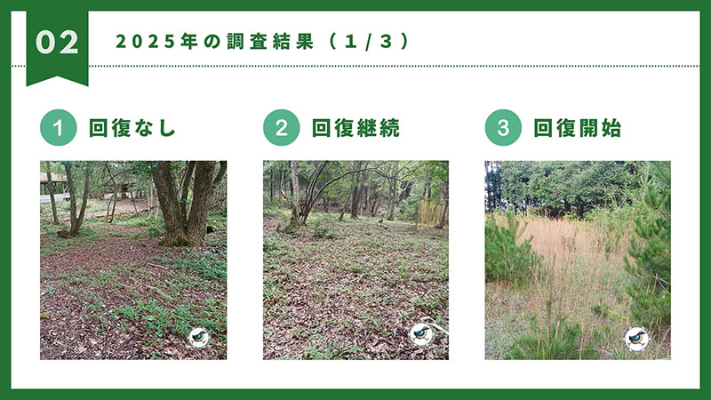 今年は、上記の①表土回復時実験していない箇所、②表土回復実験した箇所、③今年表土回復実験した箇所の合計3か所にて、令和7年10月11日にツルグレン装置で使用する土壌を持ち帰っていただきました。