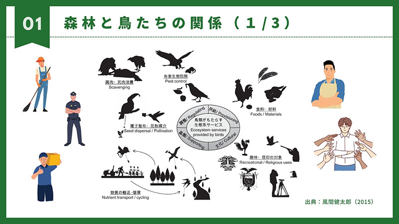 森林と鳥たちの関係とは、私たちの食料や趣味・生物との循環等とも関係していてとっても大切な循環であり、これからも守っていかなければいけない大切な存在であるとともに