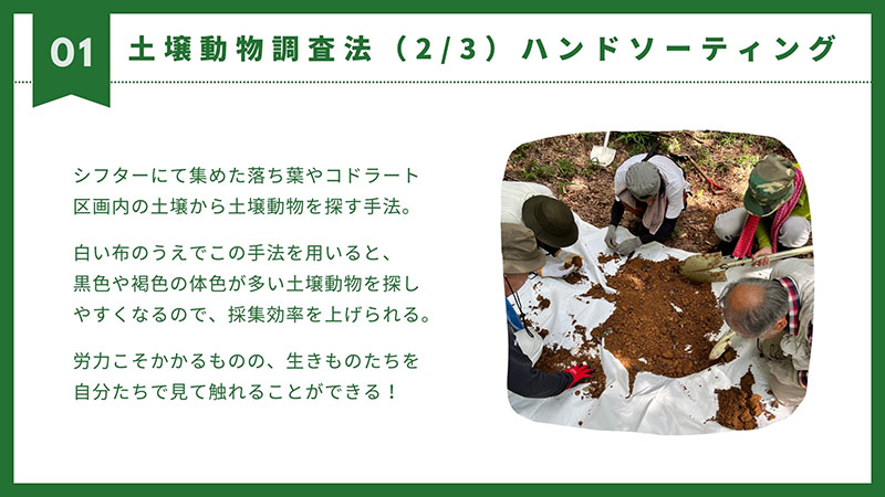 ご参加いただいた皆様、私も含めこんなに土壌動物がいろんな役割を持ち、生物多様性の中、懸命に生きている環境に改めて環境の大切さを実感した次第でした。